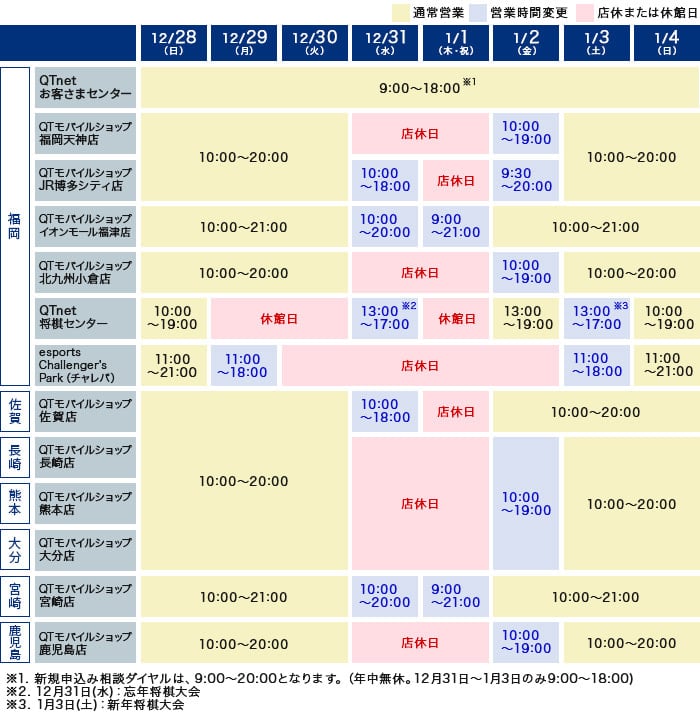 年別で見る 2025年 2024年 2023年 2022年 2021年 2020年 2019年 NEWS 当社各施設の年末年始の営業時間について お知らせ 2025年12月15日 株式会社QTnet 平素はQTnetのサービスをご利用いただき、誠にありがとうございます。 当社各施設の年末年始の営業時間は次のとおりとさせていただきます。お客さまにはご迷惑おかけしますが、何卒ご理解を賜りますようお願い申し上げます。 各施設の営業時間 一覧に戻る